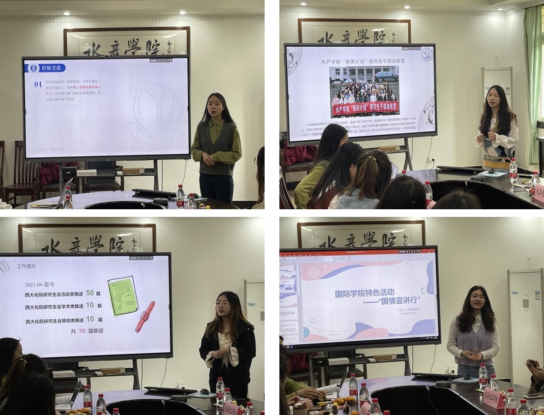 交流分享中,外国语公司、必赢76net线路官网、化学化工公司和国际公司四个公司研究生会的负责人就本公司特色工作进行了介绍,比如外国语公司的第十四届研究生英语教学技能大赛和“一站到底”研究生知识竞赛,必赢76net线路官网的“群英计划”研究生干部训练营活动,长江大保护-“鱼”你有约主题科普活动,化学化工公司的“化写青春,携手并行”师生趣味运动会、“共化青春,羽你同行”羽毛球比赛、“化在当下,情系潼心”研究生寒假社会实践活动以及国际公司的公司品牌“紫云研学”系列活动和“国情宣讲行”活动。此外,大家还共同观看了国际公司获奖作品《西南记疫》。最后,同学们讨论了研究生会目前存在的一些不足,并对未来的研究生会建设纷纷提出了展望。
