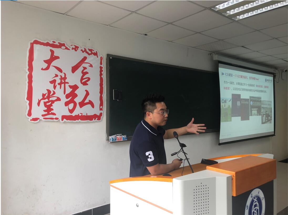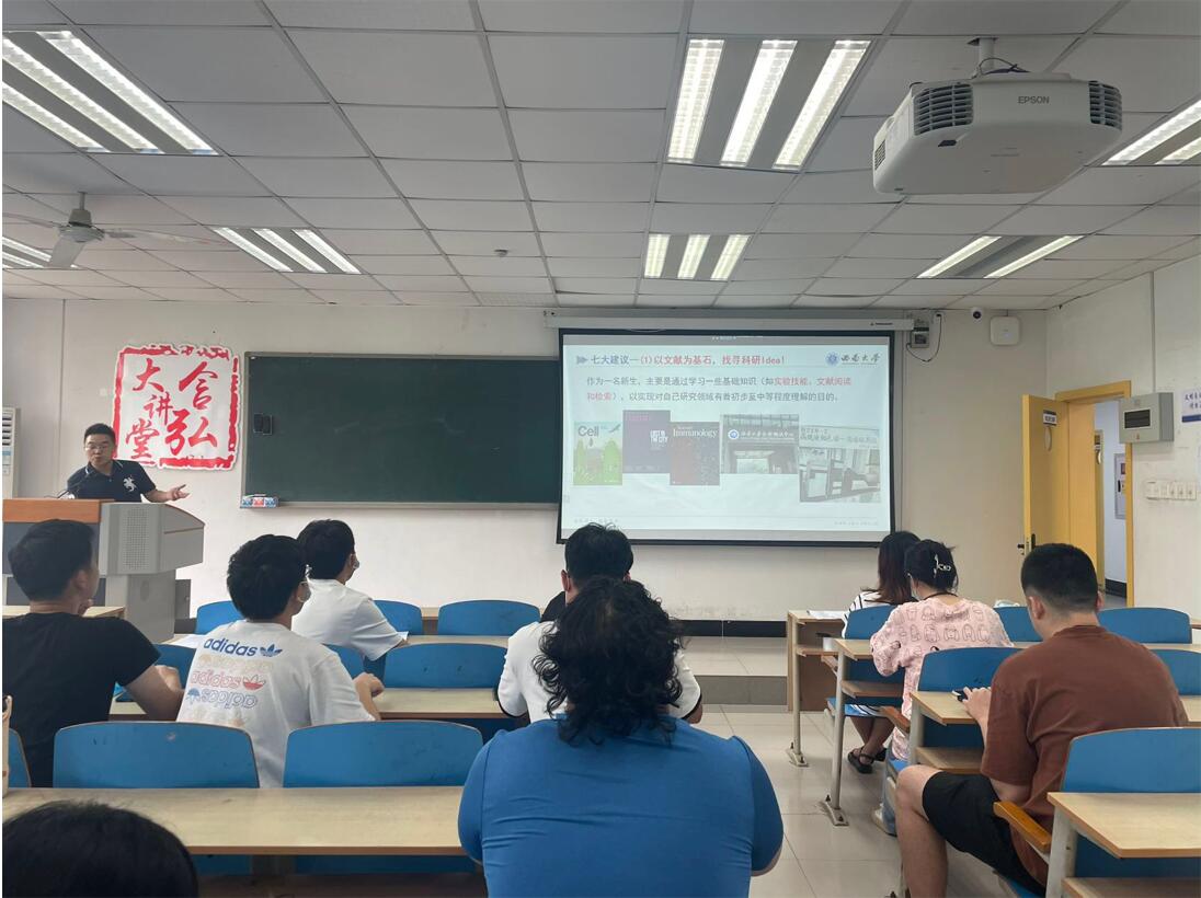 本次活动以研究生学习生活为主题,旨在引导广大研究生自觉养成良好科研习惯,营造研究生崇德乐学的学术科研氛围。何老师通过回顾他博士期间的学习与工作,为研究生们分享了科研路上的心得与体会,也给同学们得出了关于科研工作的建议。他提到,“以文献为基石,找寻科研idea,对于研一新生来说,主要是通过学习一些基础知识(如实验技能、文献阅读和检索),实现对研究领域有着初步至中等程度的理解。”同时,他强调同学们一定要做好时间管理,合理规划科研,对于每一个研究生来说何时完成实验、撰写文章、投稿都要把握好节奏,他还引导研究生要将整体重心放在科研学术上,积极开展实验进行论文写作,要充分把握研究生时光,不负韶华、不负青春。最后他分享了诸多科研过程中所需的软件、公众号等科研利器。