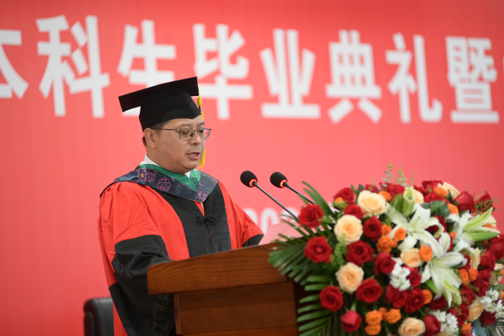 教师代表周朝伟副教授讲话,祝贺同学们顺利完成学业,他希望毕业生在即将踏上社会新征程之际,能继续怀揣着那份对知识的热爱和对未来的憧憬,保持对科学精神的敬畏和对社会责任的担当。在历练人生的舞台上,学会思考,在感悟中前行;学会感恩,感恩祖国,感恩母校和社会,感恩师长和亲人以及帮助过我们的每一个人;学会珍惜和自律,去应对未来遇到的不可预知的困难和险阻。