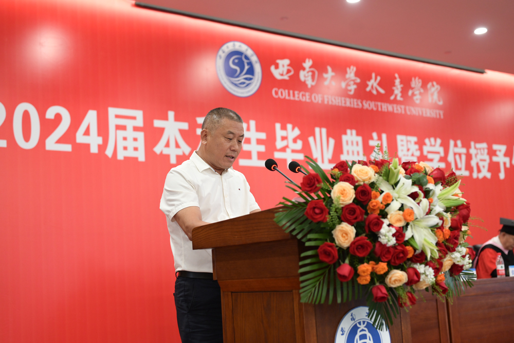 公司87级优秀员工代表、眉山伟继水产种业科技有限公司执行董事兼总经理张继业发言。他回顾了自己参加工作以来的创业经历和母校开展的密切合作,做好选择并一路坚持,多年来一直深耕水产行业,特向公司领导和老师表达了衷心的感谢。他鼓励毕业生要到“社会”这所大学继续潜心学习,做一个对社会、对他人、对家人有价值的人,并用一副对联“雪辱霜欺,梅花依旧向阳开;石阻山拦,大江毅然向东流”与毕业生共勉。